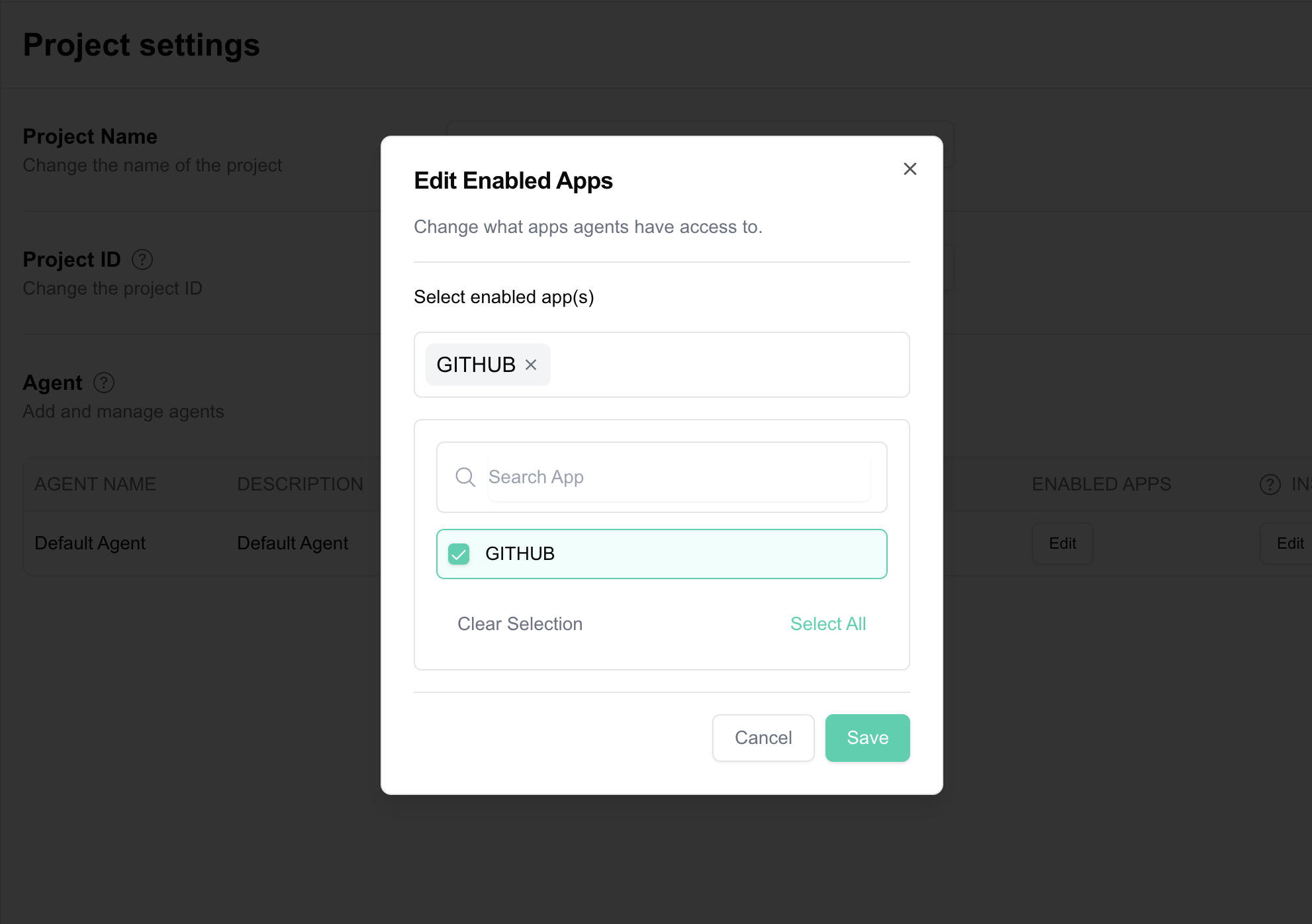 - We took an opinionated approach to acommodate a multi-agent architecture. You can create multiple agents within the project, and each agent has its own API key and apps that they are allowed to use.